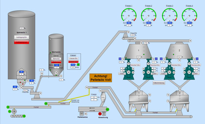 We supply our pelletising plants with the necessary switch cabinets, a PLC control and a visualisation adapted to the respective application. Thanks to the modems or network interface cards built in as standard, we are able to locate errors at any time via remote maintenance in the case of problems or disturbances in the pelletising plant and can offer further assistance to find a solution.