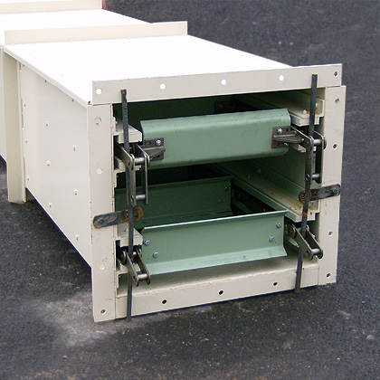 The chain conveyors can be fitted with curved sections for upwardgradients of up to 75°, in order to also fill high silos for example. Depending on the wearing characteristics of the material to be coveyed, the trough chain conveyors can also be executed with manganese steel bottom plates welded on the inside. The outputs when conveying sawdust range from 30 to 200 m³/h.